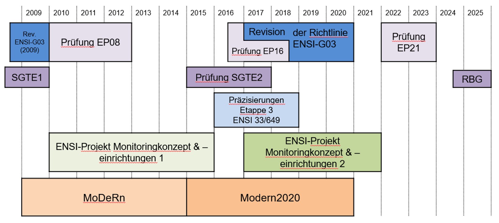 Figur 179-1: Zeitlicher Ablauf der internationalen Projekte MoDeRn und Modern2020 (orange), Monitoringkonzept und -einrichtungen 1 und 2 (grün), der Revisionen von Richtlinien, der Präzisierung der Vorgaben für Etappe 3 SGT (blau) sowie der Prüfarbeiten zu den Entsorgungsprogrammen, Sachplan-Etappen und zum Rahmenbewilligungsgesuch (RBG) (lila).